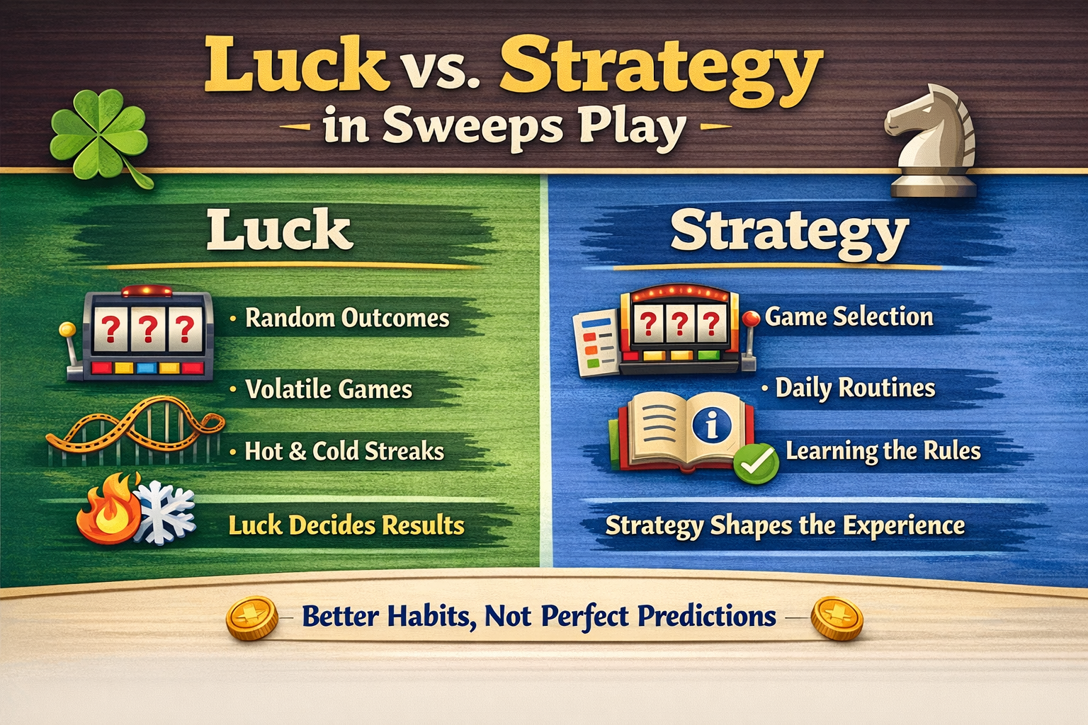 Luck and strategy are not equal partners in sweeps play: luck decides the outcome, while strategy shapes everything around it. The best habits focus on understanding the rules, choosing games that fit personal style, and staying consistent with daily offers. That turns a never-ending argument into something more useful and keeps the conversation fun.
