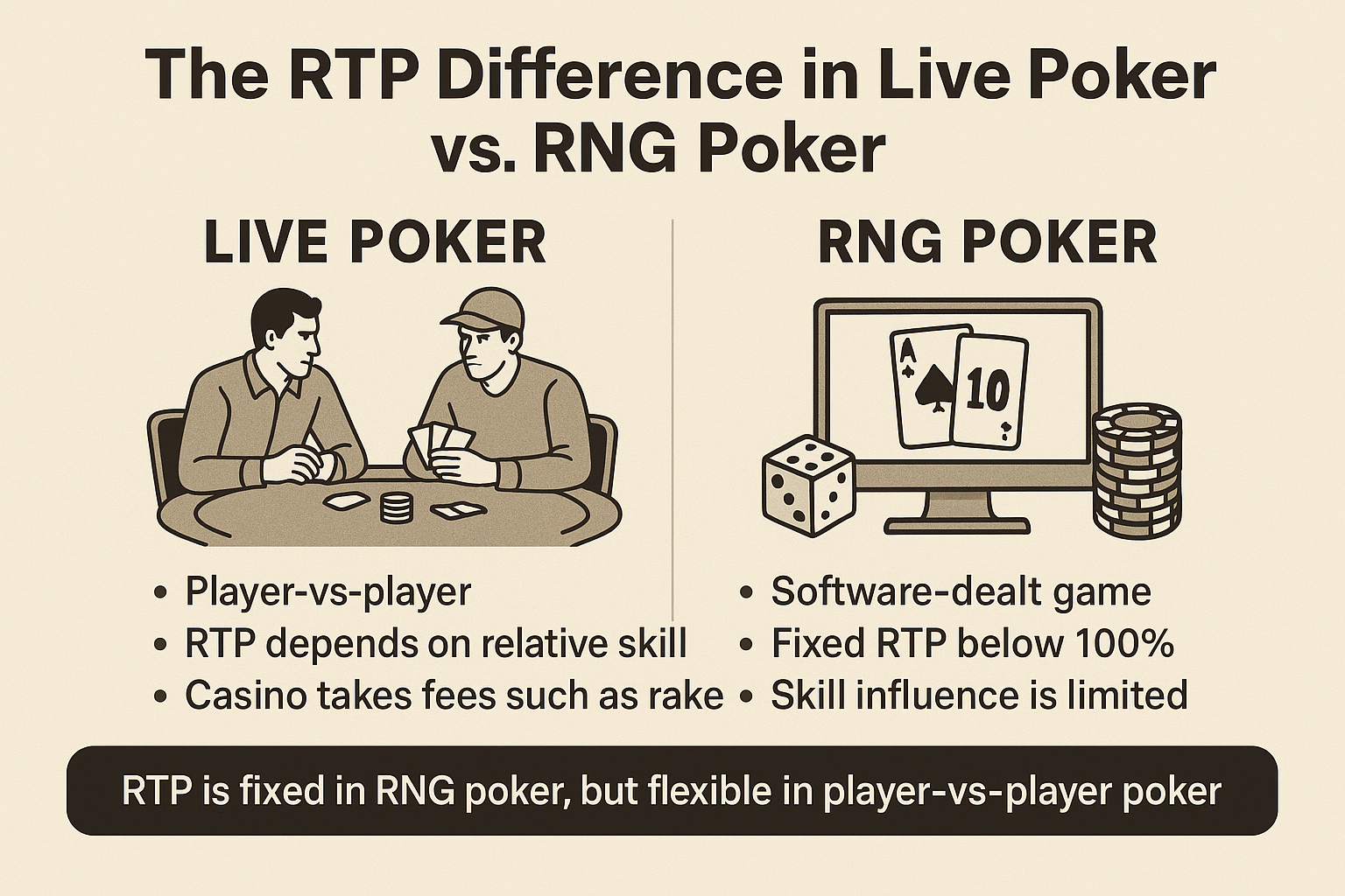 In Live Poker, players try to outsmart each other and the individual skill of players significantly alter the expected RTP. In RNG Poker, participants play against casino software where skill has limited impact and the RTP is fixed below 100% over the long term.
