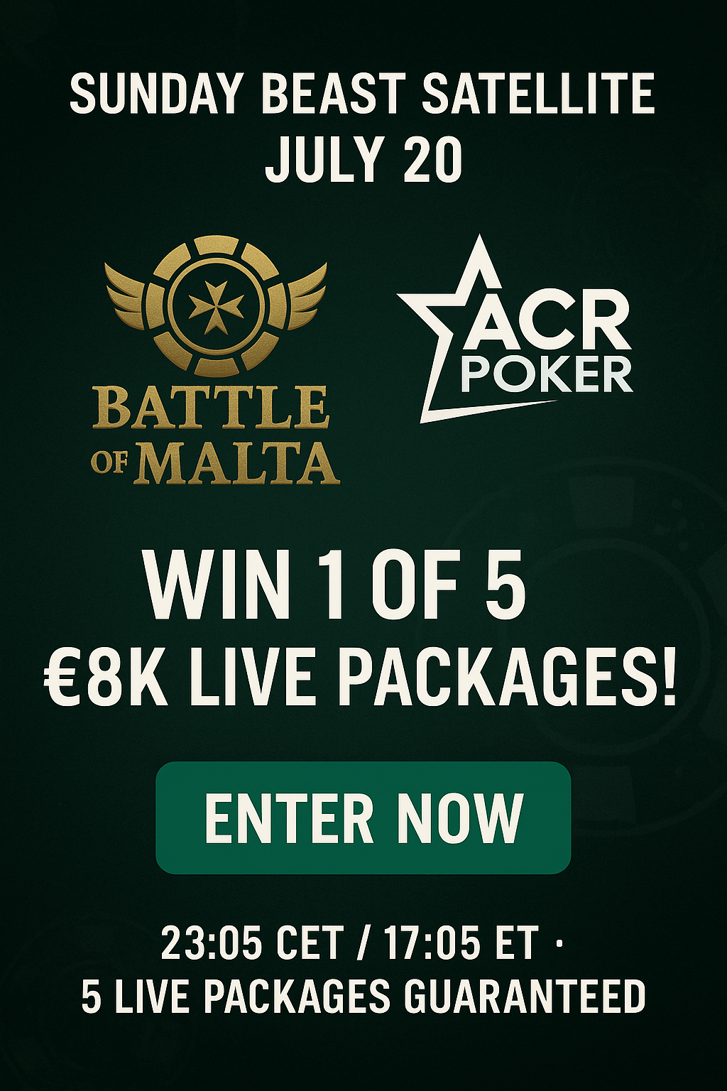 ACR Poker has teamed up with the iconic Battle of Malta festival for the first-ever online edition, running 13 - 27 July with a guaranteed $5 million (€4.6 million) prizepool across 68 events. Beyond cash prizes, the deal includes ten €8K live packages via two “Beast” satellites (July 13 & 20) and main‑event satellite qualifiers.