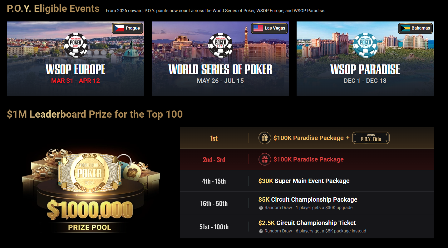 This year, WSOP Paradise 2026 carries a special significance with the updated WSOP Player of the Year competition. This prestigious leaderboard contest now includes all three major series: WSOP in Las Vegas, WSOP Europe, and the final WSOP Paradise.