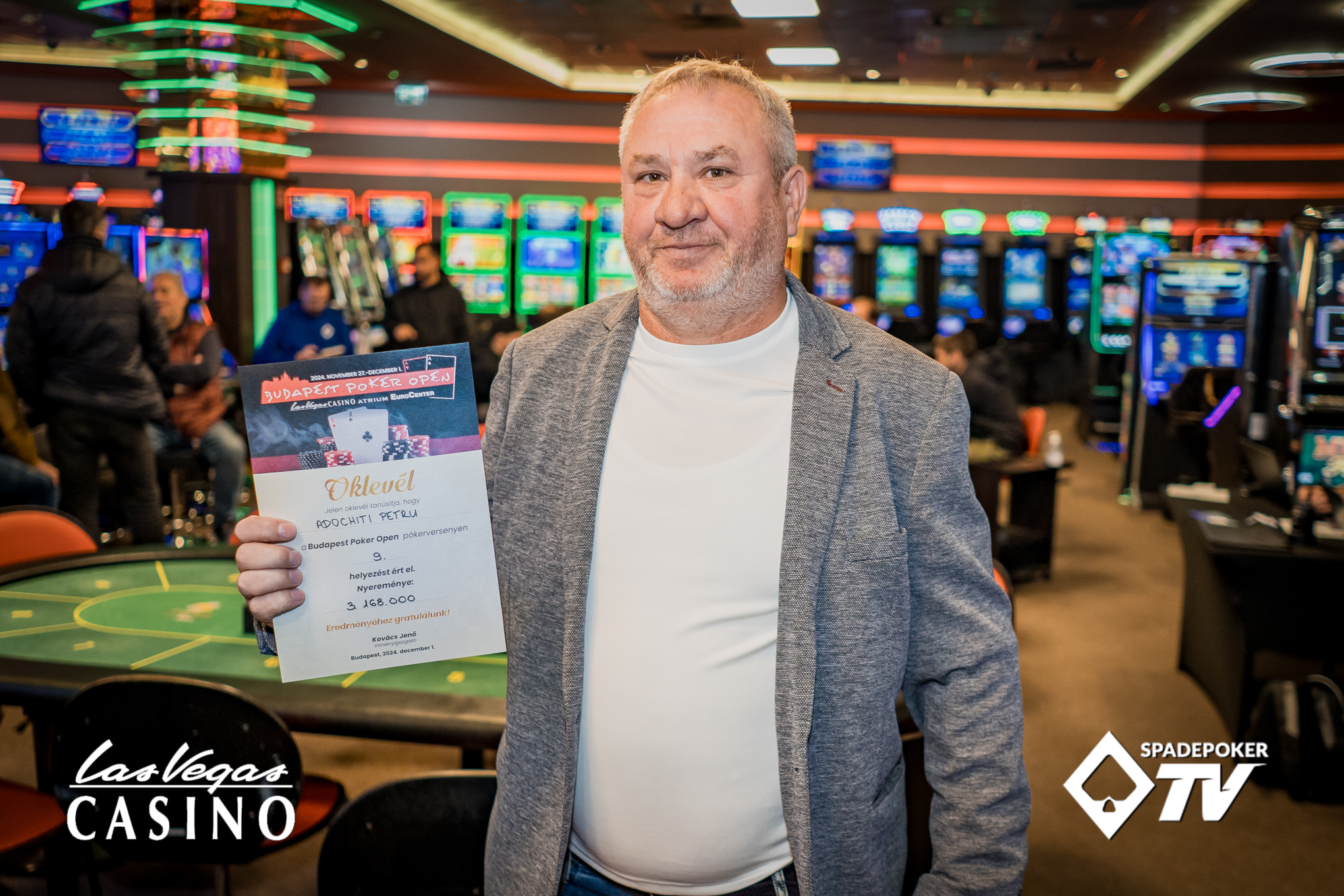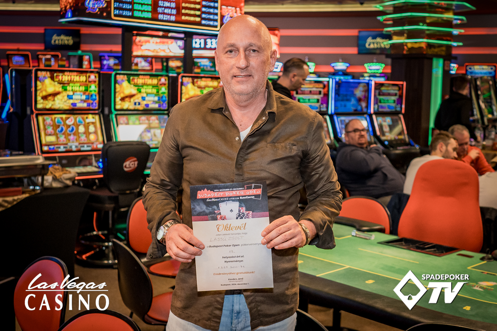 Győrffy előtt már csak 4bb volt, így mikor K d Q s -t kapott egyértelmű döntés volt az all-in. Pechjére Vrancsik Zoltán A h J d -ba futott és a K c J h A s J s 7 s board nem segítette ki. Már csak 26 pókeres van játékban.