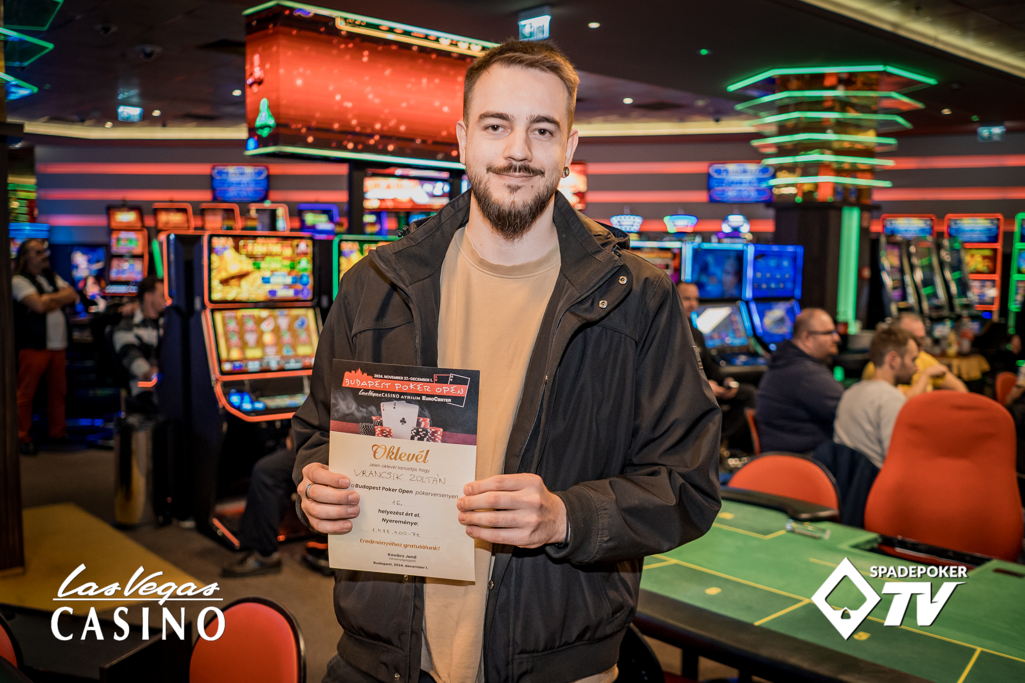 Már csak 34 pókeres maradt játékban, miután Váczy-Burány László is kiesett. Stackjeinek nagy részét Adochiti Petru ellen bukta el. Abban a leosztásban Váczy UTG-ből nyitott 12k-ig, amit Petru adott MP-ből és a BB. A T d 9 s 9 c flopot a BB elcheckelte, Váczy ismét 12k-ig betelt, amit Petru megadott, de a BB már dobott. A turn 3 h -at már Váczy inkább csak elcheckelte, majd megadta Petru 32k-s betjét. A Q c river után mindketten checkeltek, Váczy A h T c -t mutat, Petru pedig K h Q d -t. Váczy short lett és a következő leosztásban elbukta maradék zsetonjait is.