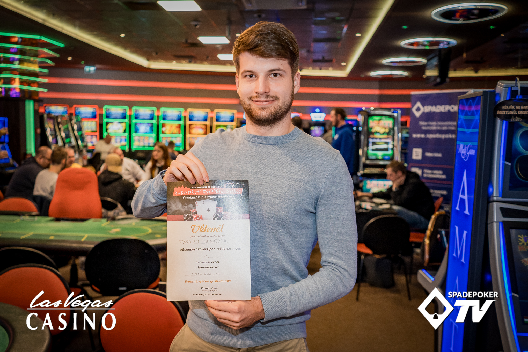 Bundik UTG+1-ről 15k-ig emelt, Páris pedig a CO-ró callolt. A flopra 9 s Q c 4 c jött, Bundik 25k-ig betel, ellenfele pedig megad. A K s turn után Bundik all-in megy, amit Páris örömmel megad. Bundik A s A h , Páris J s T s . A riverre érkező 8 d már nem változtat az erőviszonyokon, Bence a sorának köszönhetően nagy stackre tesz szert.