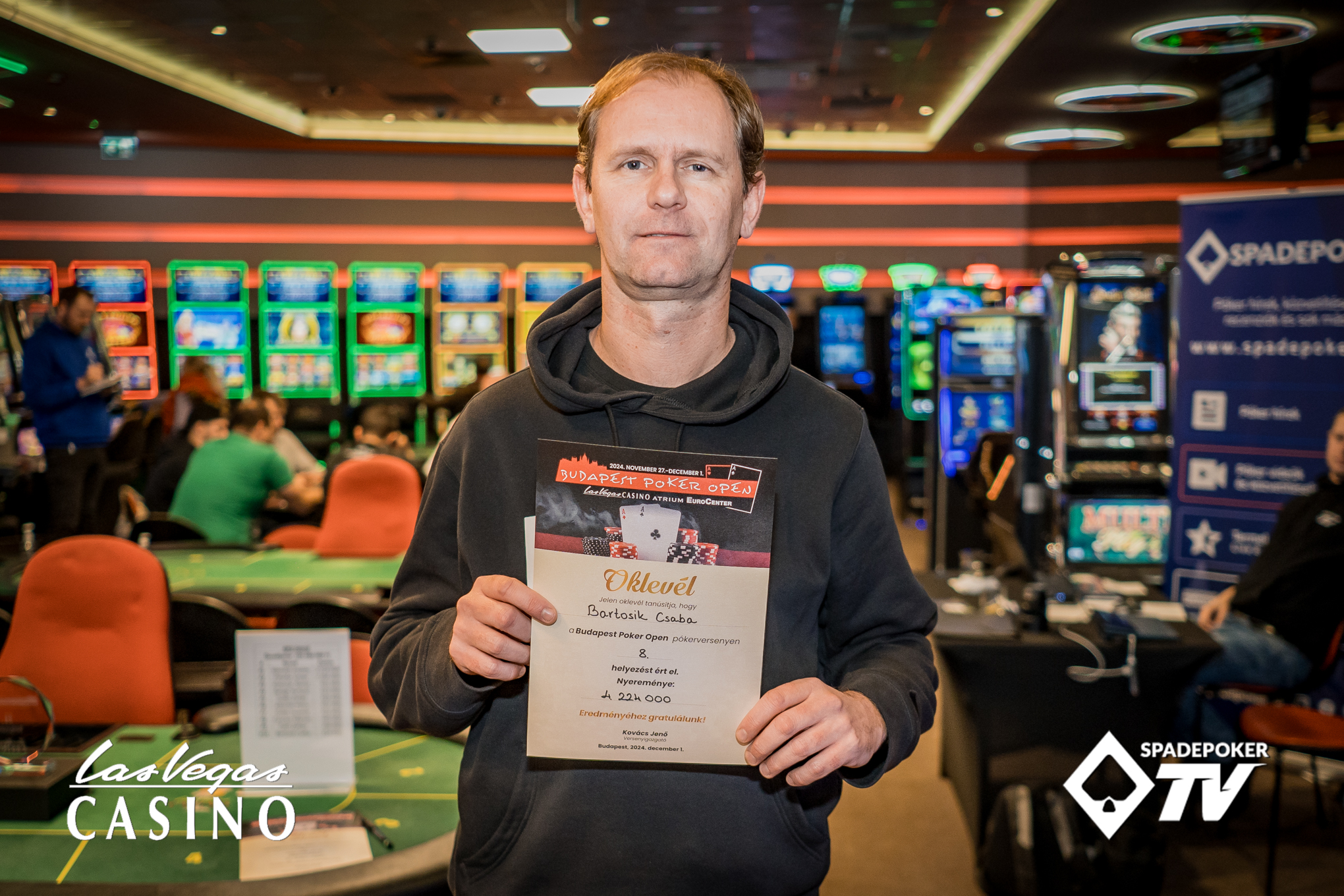 Először Bartosik ( A h K h ) 88k-s all-injét adta meg T d T h -el, majd a 8 c 6 d 5 s 3 c K c board után bukta a potot.