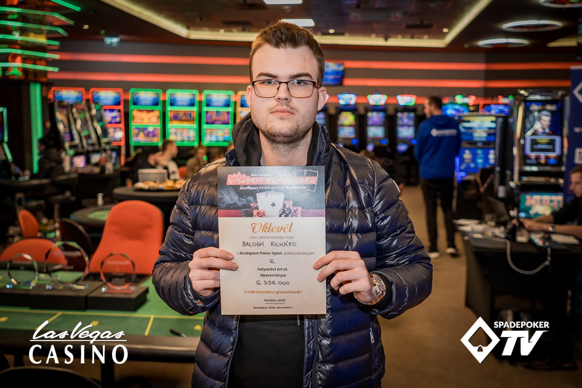 Balogh Richárd a CO-ról nyitott 20k-ig, Ocztos pedig a BB-ről adott meg. A 4 d 4 h A s flopot mindketten elcheckelték, a turn T h után Ocztos checkel, majd Balogh 10k-s betjére 25k-ig raisel, amire callt kap. A 6 h riveren Ocztos all-in megy, de csak 48k van már előtte, ennek ellenére Balogh inkább foldol.