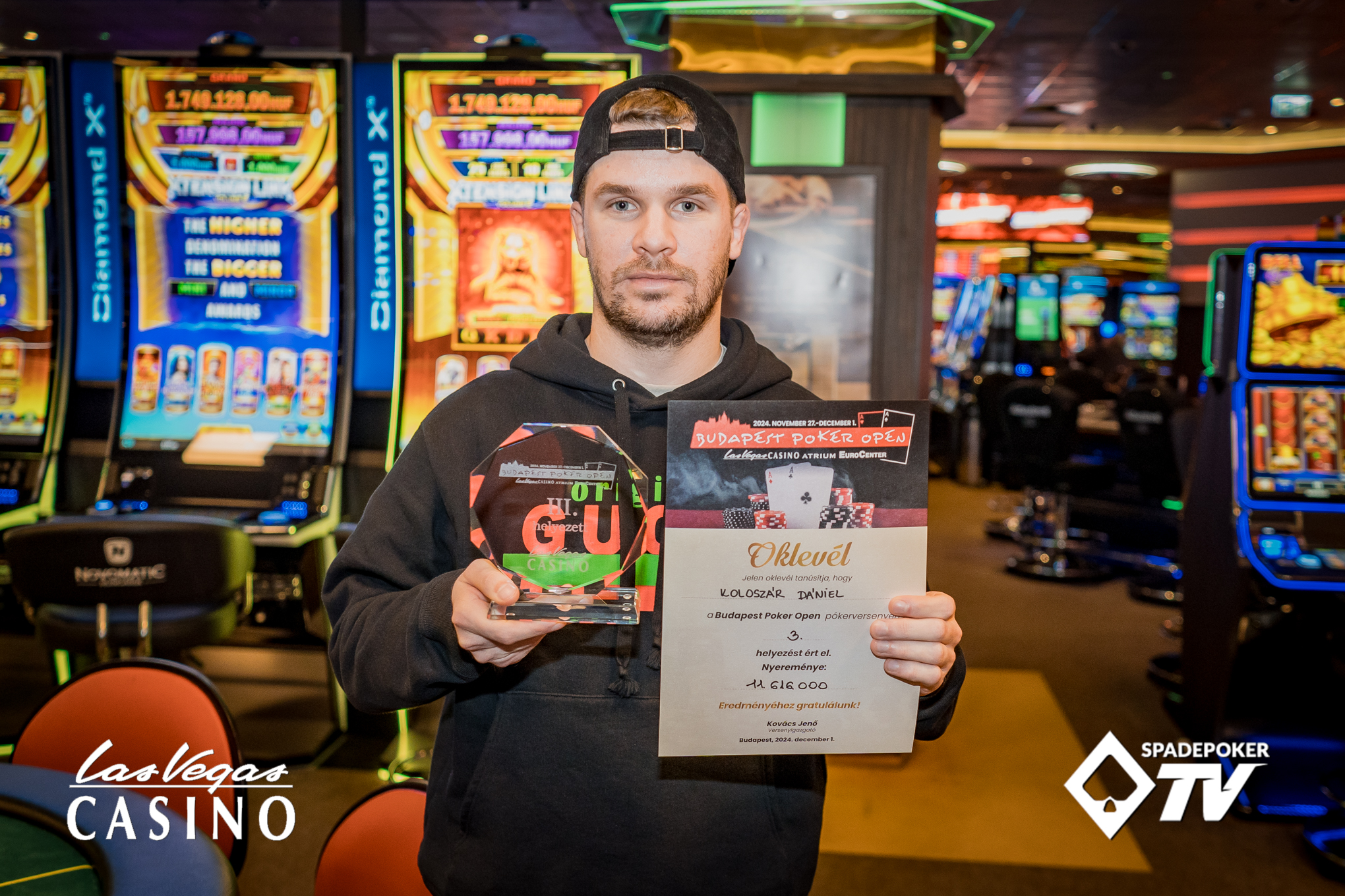 Bár a flop első lapja egy 4 d volt, azt rögtön egy K d követte és ez elegendő volt ahhoz, hogy Koloszár elvigye a potot. Dániel stackje 555k-ra nőtt.