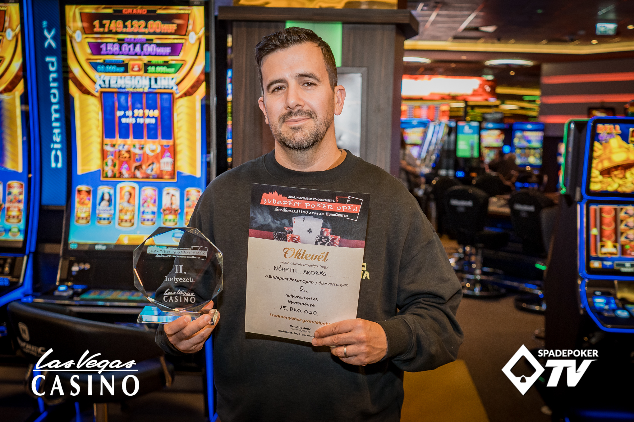 Újabb sikeres leosztást tudhat maga mögött Németh András, míg Ádámszki Tamás számára véget ért a torna. Tamás 2 c 2 d -vel ment all-in, de Andrásnál A s A c voltak, amik a 6 s 8 c J c T h 3 h boardon ki is tartottak. Németh előtt már kb. 900k tornyosul.