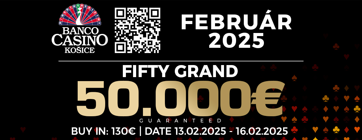 Jövő héten, egészen pontosan február 13. és február 16. között kerül megrendezésre a kassai Banco Casinoban a Fifty Grand következő kiadása, amely 50.000 eurós garanciát kínál. A helyi és külföldi játékosok körében egyaránt nagy népszerűségnek örvendő versenyen öt flight vár rátok, amelyekre 130 euró fejében nevezhettek. A kezdő stack 50.000 lesz és minden flightról a nevezők legjobb 10%-a juthat tovább a vasárnapi döntőbe.