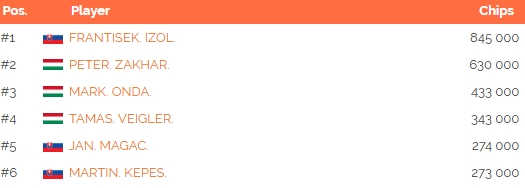 A tegnapi első játéknapon 56 játékos vett részt, tehát 6-an juthattak tovább. Azok közt 3 magyar pókeres is szerepelt Zakhar Péterrel az élen.