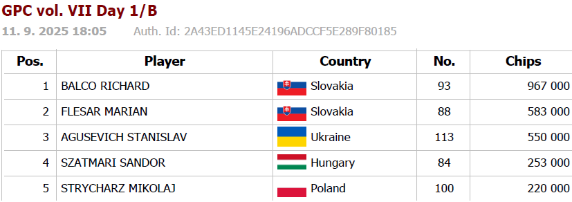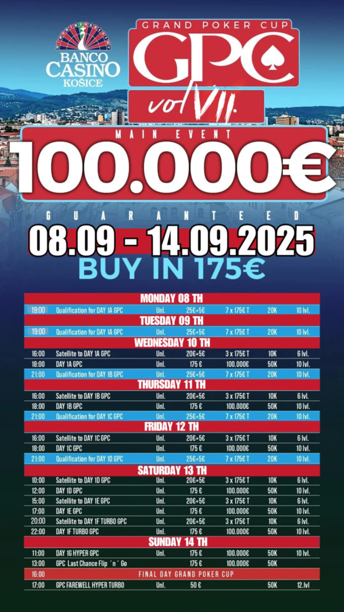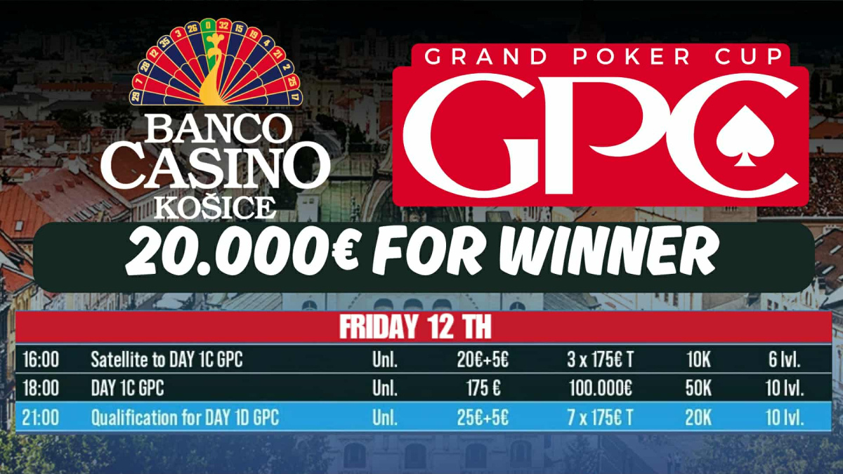 A Banco Casino Košice pénteki programja az 1C flight Grand Poker Cupjával folytatódik, ahol újabb potenciális bajnokok "születnek". A torna kezdete ismét 18:00 órára van tervezve.