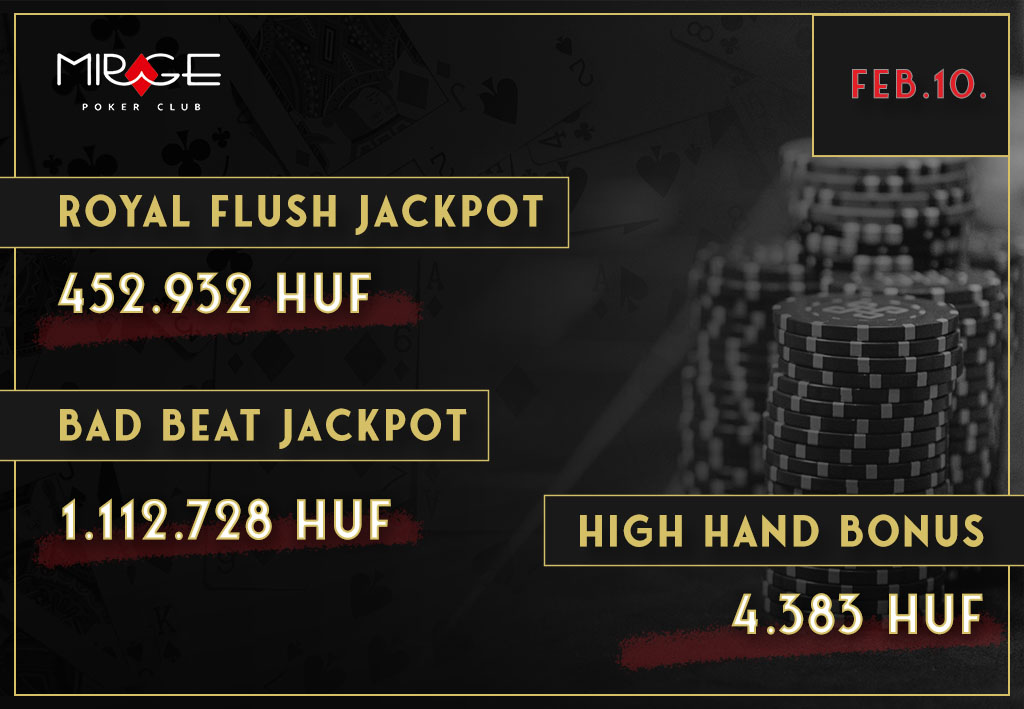 A február remekül indult a Mirage Poker Clubban, és a budapesti klub látogatói minden nap izgalmas versenyekre számíthatnak, amelyek nevezési díja 3.000 és 50.000 forint között mozog. Február második hetének programja is gazdag lesz és két remek torna is indul, amelyek nyereményalapjába várhatóan egyenként 2.000.000Ft kerül - pénteken egy 18.000 forint nevezési díjú rebuy-torna, szombaton pedig egy 20.000 forint nevezési díjú add-on-torna. Ha a nevezési díjak meghaladják a bankrollodat, akkor se ess kétségbe - a versenyek előtt 15:30-kor egy 3.000 forint nevezési díjú szatellitet is rendeznek, amelynek nyereménnyalapjában 5 jegy lesz.