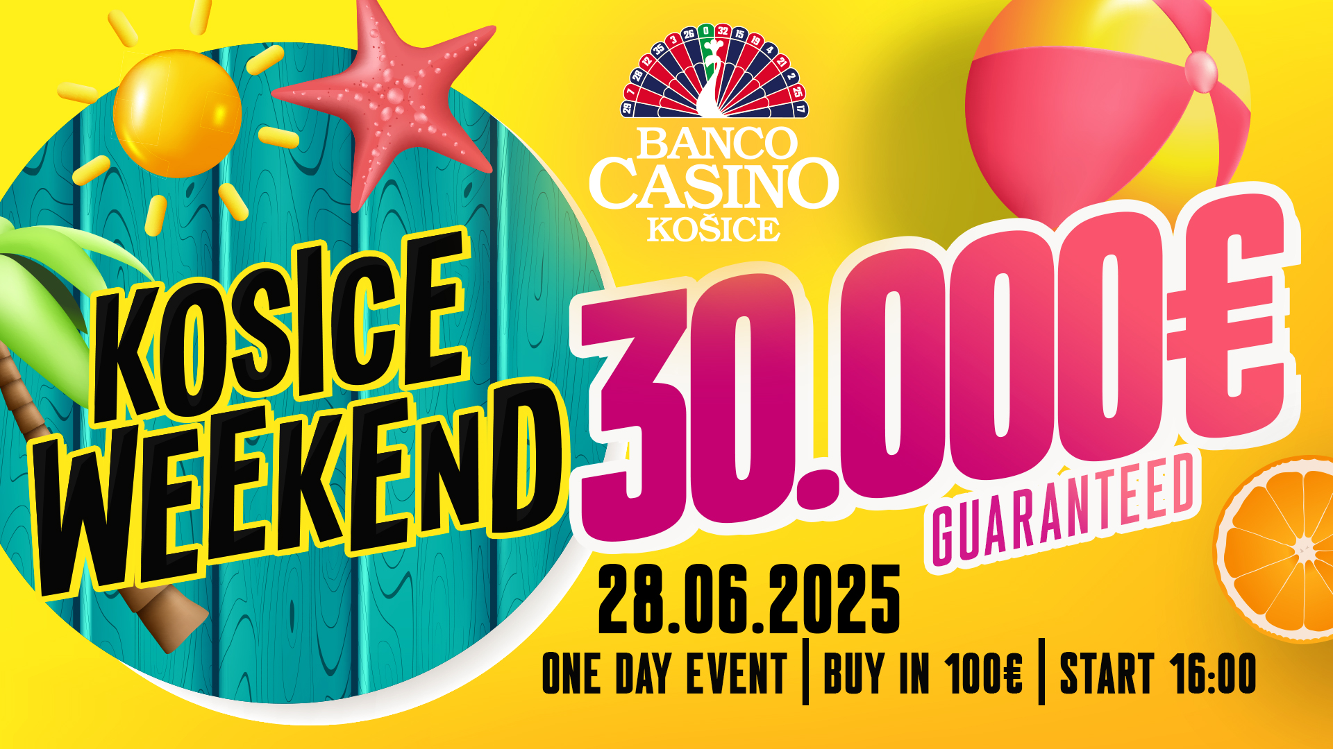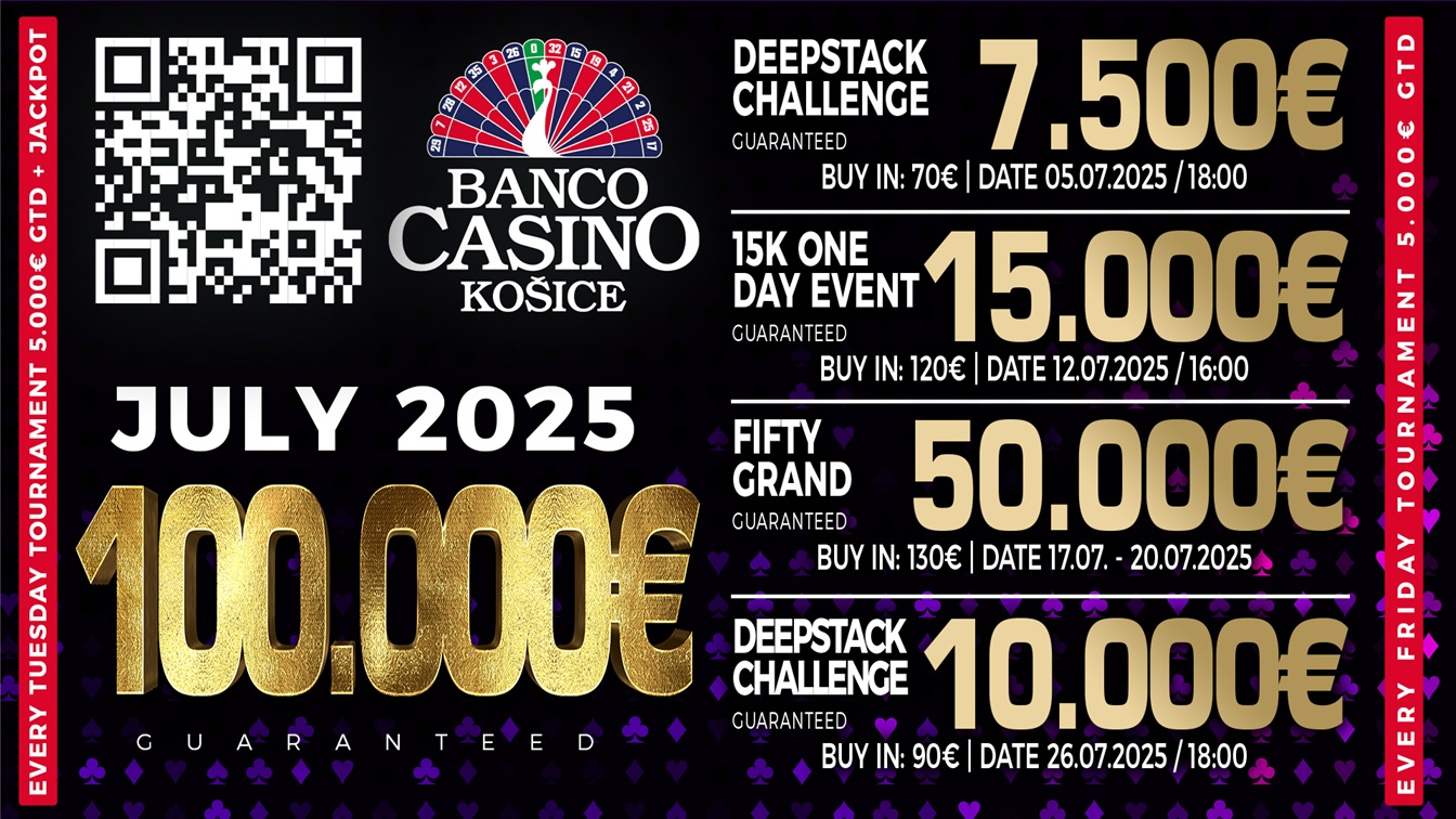 Június 28-án, szombaton minden a Košice Weekendről szól majd a kassai Bancoban. A hónap legnagyobb tornája most történelmi 30.000€ garantált nyereményalappal és változatlan, 100€-s nevezési díjjal várja a játékosokat. A startpisztoly 16:00-kor dördül el, minden induló 50.000 zsetonnal ülhet le az asztalokhoz, és a regisztráció egészen a 12. szint végéig nyitva áll majd. A garantált nyereményalap miatt ezúttal is teltház várható!