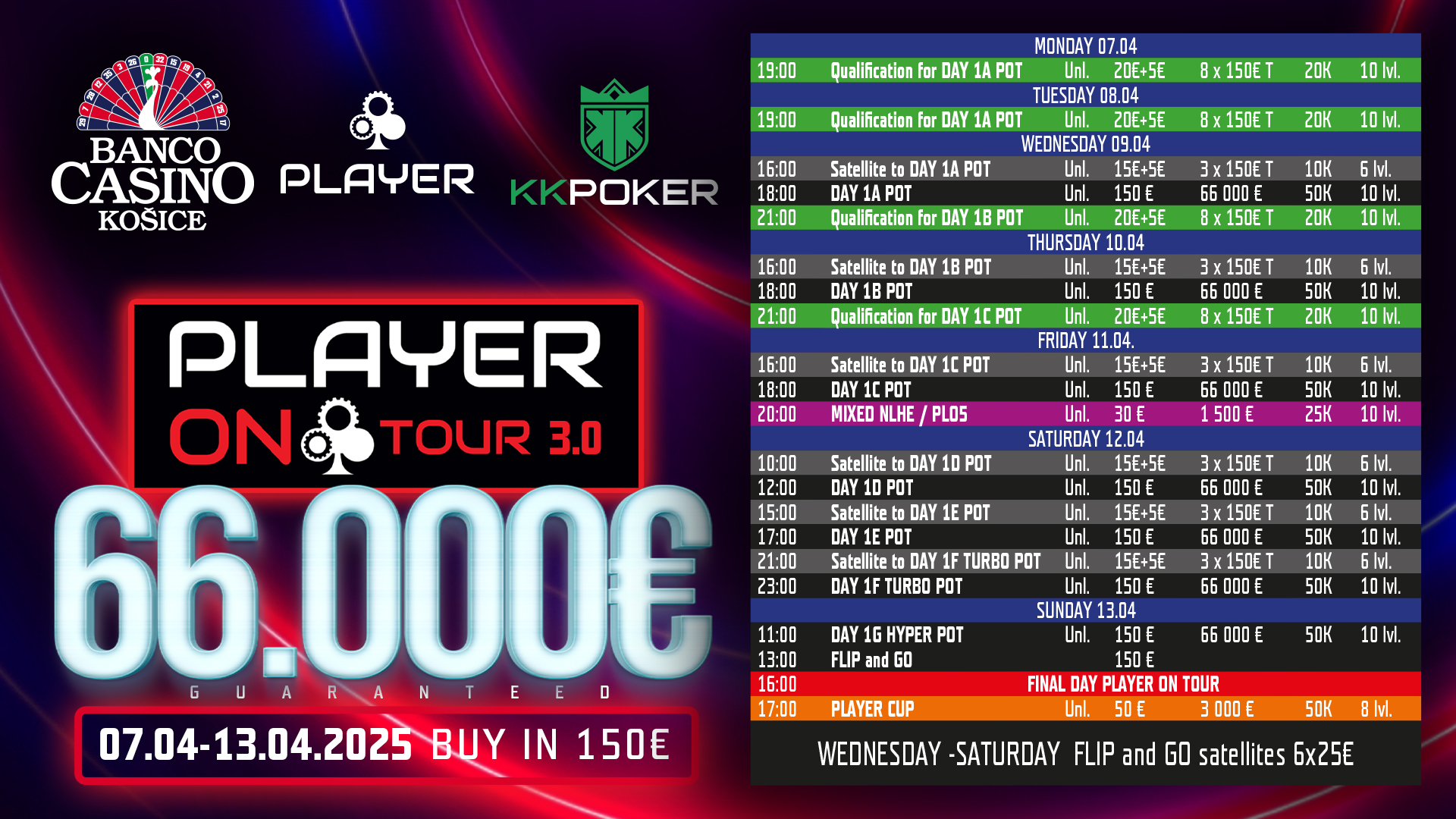 Figyelem változás! A Player on Tour harmadik kiadássának időpontja megváltozott, és április 7-13. között kerül megrendezésre. A Player on Tour pókersorozat ezúttal még nagyobb garanciával tér vissza Kassára. A 150€-s nevezési díj mellett 66.666€-s garancia vár a résztvevőkre, így a bajnok 5 számjegyű jutalmat vihet majd el.