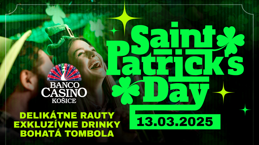 Márciusban nem csak Írországban, hanem a kassai Banco Casinoban is megrendezésre kerül a Szent Patrik-nap. A kaszinó zöldbe öltözik, sörből sem lesz hiány, és tombola is lesz a játékosok számára. Ne hagyd ki ezt az egyedülálló eseményt, amelyre március 13-án kerül sor.