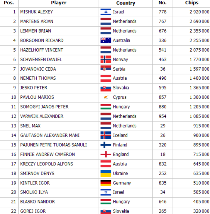 A 15 lejátszott vakszint után végül 22 pókeres jutott tovább a mai döntő napra. A virtuális chipleader székre az izraeli Alexey Mishuk ült, aki nemrégiben egy lengyelországi eventen is diadalmaskodott. Ő vezeti a döntősök mezőnyét, és a cél persze a Main Event-trófea, valamint a 31.034€-os fődíj megszerzése.