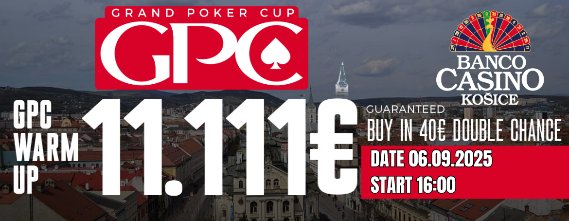 Az őszi program már kopogtat az ajtón. Hetedik alkalommal várhatjuk a Grand Poker Cupot, amely ismét egy Main Eventet hoz 100.000€ garanciával. A Grand Poker Cup szeptember 8.-tól 14.-ig zajlik. A Main Event előtt megrendezik a GPC Warm Up-ot 11.111€ garanciával és 40€-os double chance buy-innal. Jelölje meg a naptárában 6.9.2025, amikor ez az egynapos esemény lesz.
