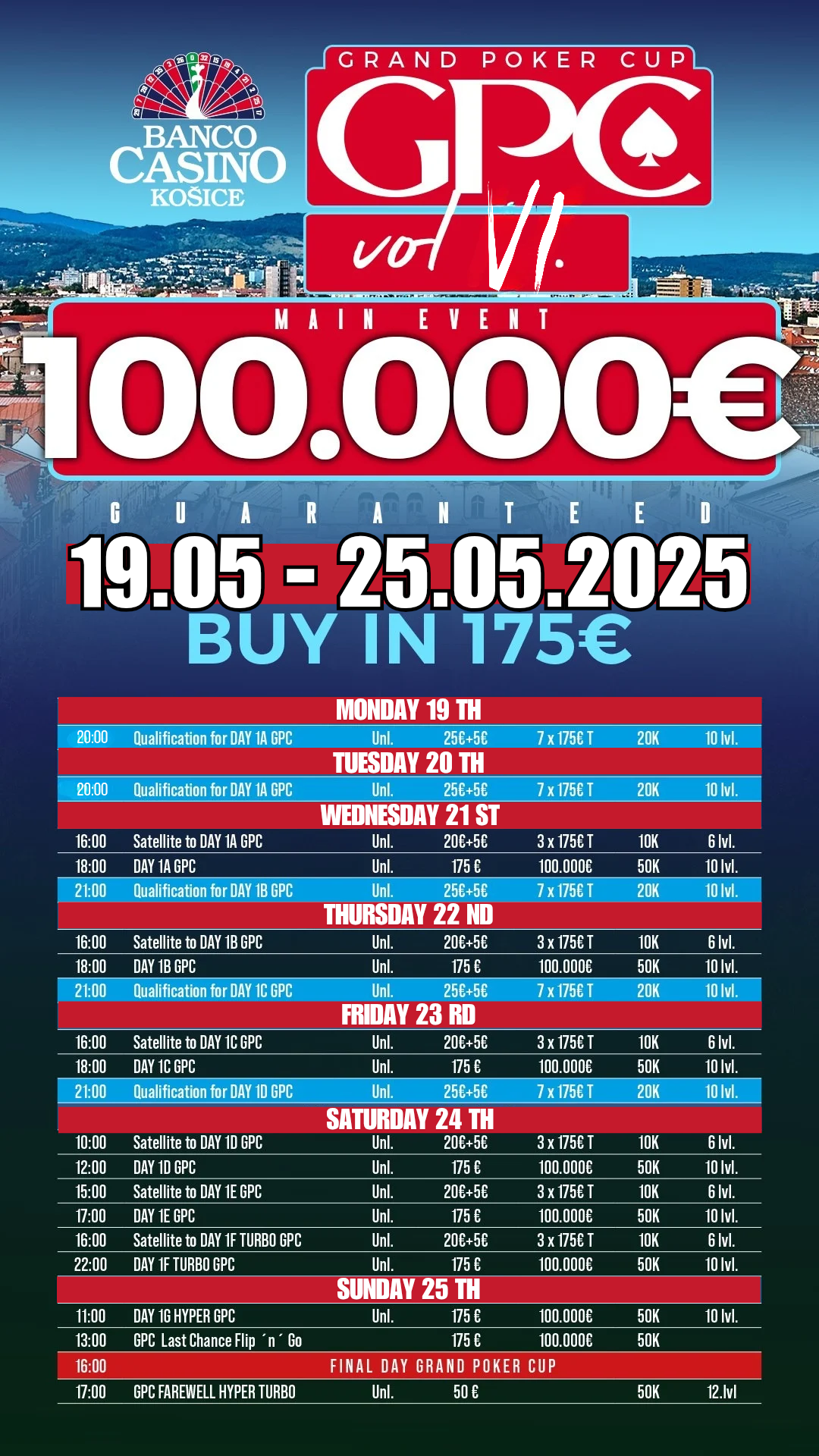 A Main Event buy-inje a szokásos 175 €, amiért minden játékos 50.000 chipből álló stacket kap, és a regisztráció tíz szint végéig lesz nyitva. Minden továbbjutó vasárnap, május 25-én találkozik a döntő napon, ahol legalább 100.000 €-os prizepool kerül szétosztásra. Az összes torna menetrendje alább tekinthető meg.