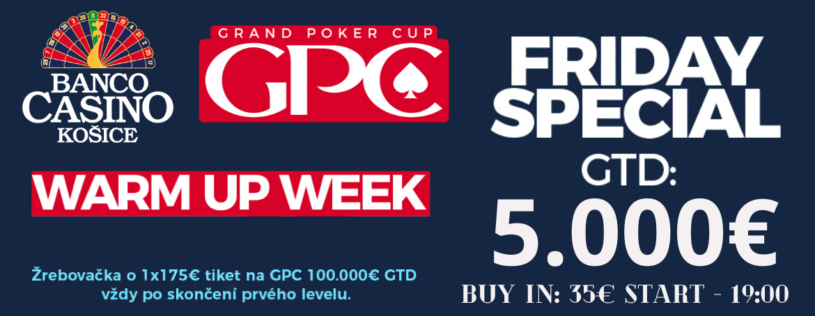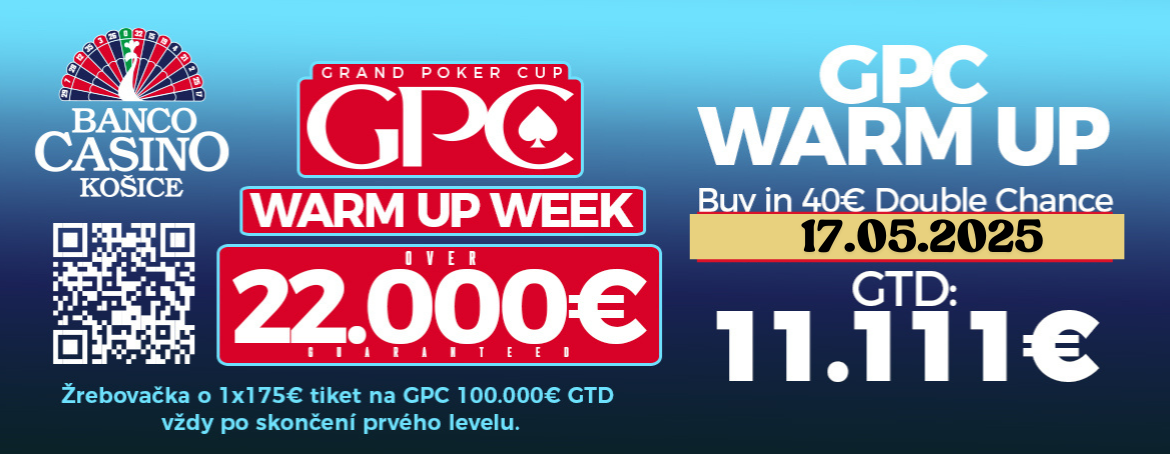 A GPC Warm Up Week utolsó egynapos versenye a szombati GPC Warm Up torna lesz, 11.111 € garanciával. A versenyre a belépő 40 €, amiért 20.000 chipből álló stacket kapsz. A Banco Casino Košice kapui 16:00 órakor nyílnak, onnantól kezdetét veszi a harc a nagy nyereményekért. A szintek minden 30. percben emelkednek, a regisztráció tizenkét szint végéig lehetséges. Sikerül neked felturbóznod a bankrollod a Grand Poker Cup kezdete előtt?