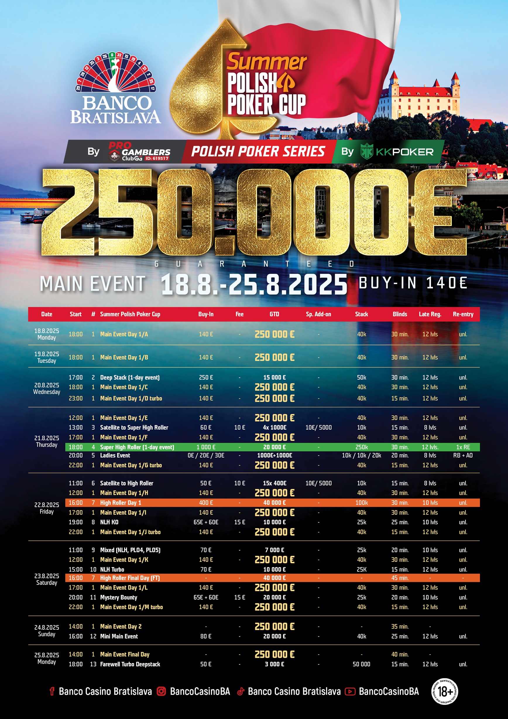 2017 óta rendszeresen rendeznek lengyel pókerversenyeket Szlovákiában, ahol a Banco Bratislava és a Polish Poker Series együttműködése mindig vonzóbb és nagyobb pókerversenyeket hoz. Az idei nyári kiadás sem marad el ettől, hiszen színes versenypalettát kínál a Summer Polish Poker Cup. A legizgalmasabbak versenyek között lesz a Highroller – 40.000€ GTD, Super Highroller – 20.000€ GTD, Deepstack – 15.000€ GTD, Mystery Bounty – 20.000€ GTD, Mini Main Event – 20.000€ GTD, valamint a 250.000€-s garanciájú Main Event.