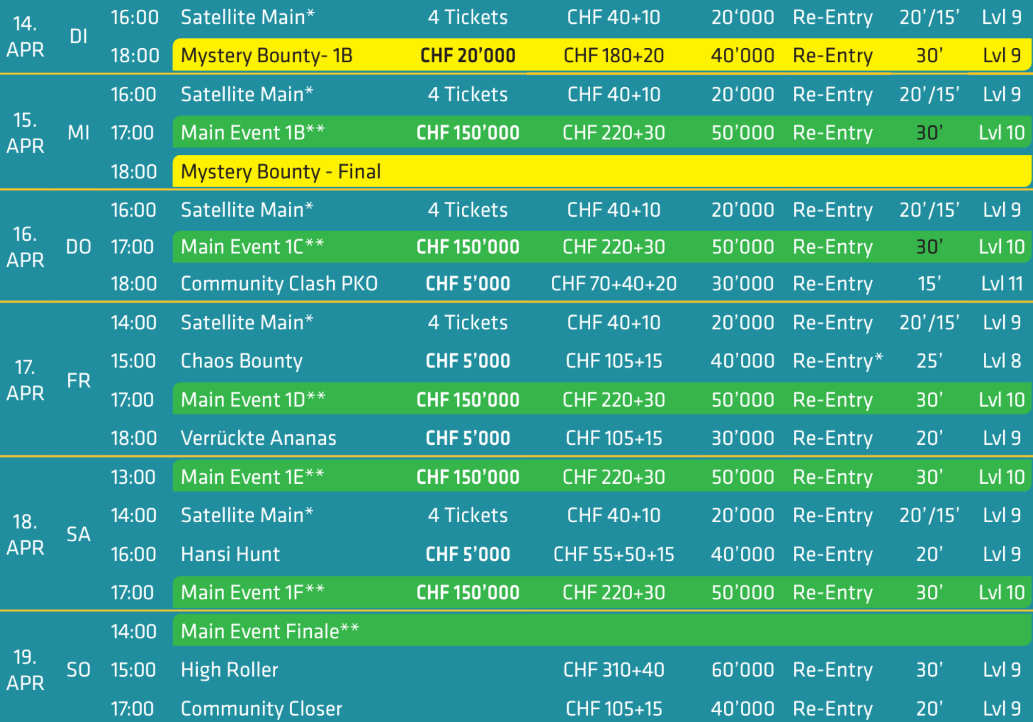A fesztivál azonban nemcsak a főversenyre épít. Már a kezdetektől fogva elindultak a szatellitek a Main Eventre, amelyek lehetőséget adnak a játékosoknak, hogy alacsonyabb költséggel csatlakozzanak a versenyhez. A programot tovább színesíti a Mystery Bounty 20.000CHF garantált nyereménnyel, valamint kisebb közösségi események, mint a Felix Freezeout, Community Clash PKO, Chaos Bounty, Verrückte Ananas vagy Hansi Hunt. A fesztivál zárásaként pedig egy High Roller és Community Closer is tervbe van véve, így a program változatos, hogy a rekreációs játékosoktól a rendszeres grinderekig mindenki megtalálja a számára vonzó eseményeket.