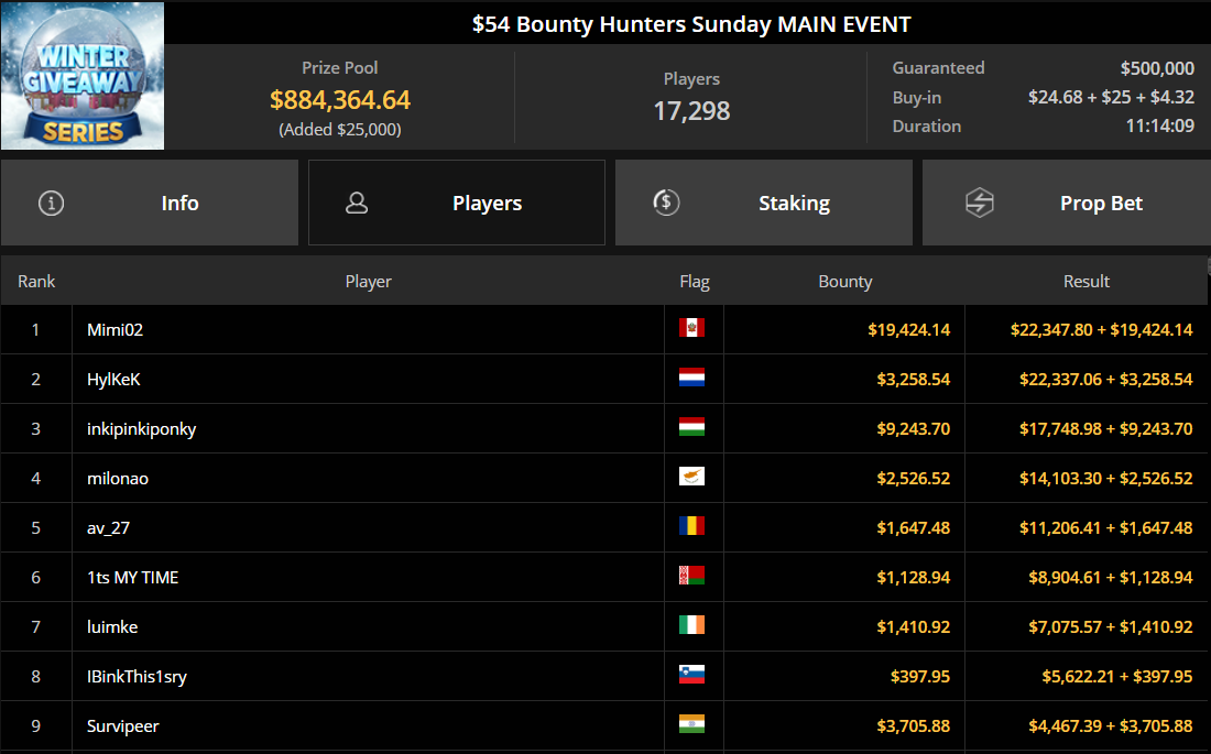 A GG termében zajló $54 Bounty Hunters Sunday Main Event 500.000$-os garanciát kínált, ezt a remek ár/érték arányt pedig rengetegen kihasználták. A tornára végül 17.298 nevezés érkezett, így a nyereményalapba 884.365$ került. A hatalmas mezőnyön egy magyar pókeres is átverekedte magát, inkipinkiponky egészen a torna utolsó asztaláig jutott, majd végül a 3. helyet szerezte meg, ami 9.244$-t ért, ráadásul a bountykból még további 17.749$-t vihetett el. Az össznyereménye tehát 26.993$ lett, ami fantasztikus oddsot jelent az említett nevezési díj mellett.