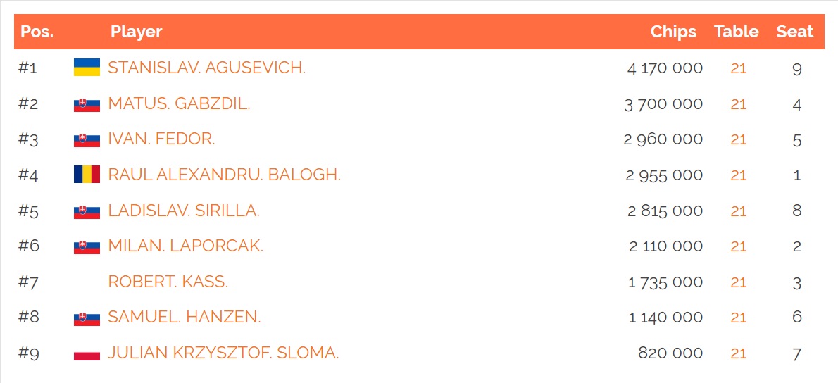 A döntő asztal csak hajnali 4 óra körül alakult ki, arra pedig egy magyar játékos is bejutott Kass Róbert személyében, aki a 7. helyen állt.