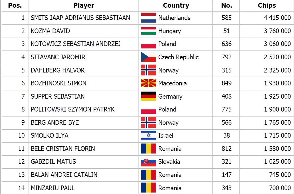 A regisztrációk lezártakor 250 pókeres maradt még játékban, de ITM-be csak 126-an érhettek, így még a mezőny fele üres kézzel kellett, hogy távozzon a tornáról. A nap végére egy hármas kiesésnek köszönhetően már csak 14 pókeres maradt játékban, köztük Kozma Dávid is, aki a második legnagyobb stackel vághat neki a döntőnek!