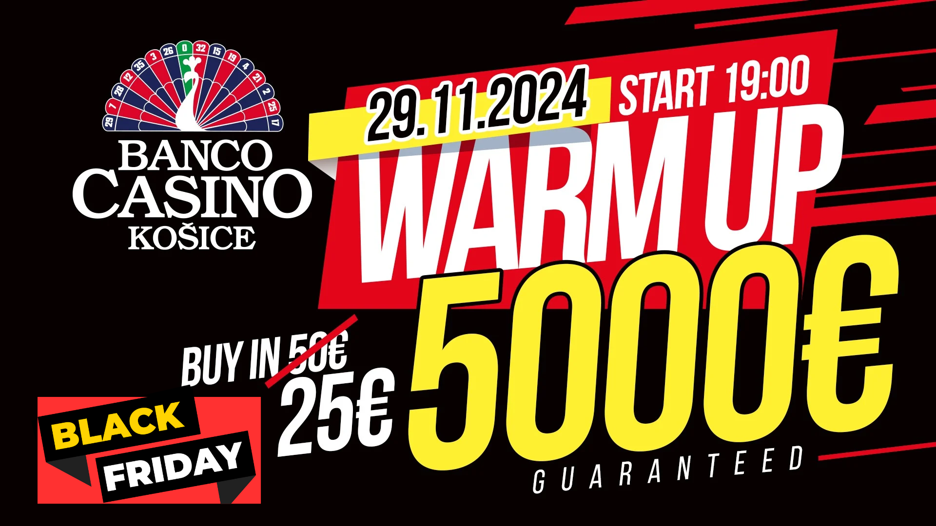 A november lassan, de biztosan a végéhez közeledik, és a Banco Casino Košice egy igazán nagyszerű ajánlattal készült játékosainak erre a hétvégére. A mai napon kerül megrendezésre a Warm-Up verseny, amelyet "black firday" jelzővel illettek. Az 5.000€ garanciájú verseny nevezési díját az eredeti 50€-ról 25€-ra csökkentették, ami valóban egy olyan ajánlat, amit nem lehet visszautasítani.