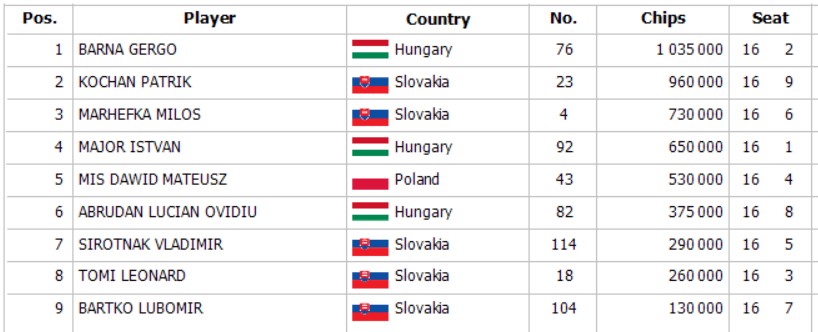 Végül Gergo Barna az ötödik helyen végzett, és a chipleader pozíció sem biztosította számára a győzelmet. A győzelem végül a két szlovák játékos, Leonard Tomi és Miloš Marhefka között oszlott meg, akik egyenlően osztoztak a nyereményalapon. Mindketten 2.304€-val távoztak a Banco Casino Košicéből, amely tartalmazta a Grand Poker Cup jegyet is, amihez gratulálunk nekik.