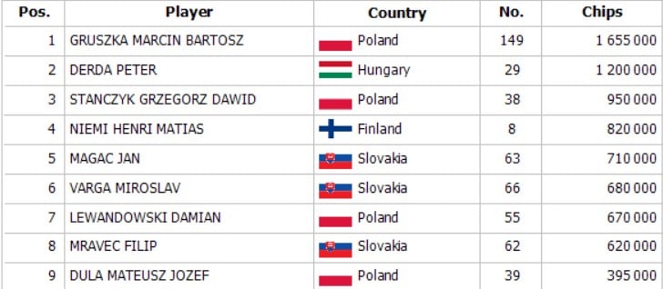 A végjátékban három lengyel játékos maradt versenyben. Először Grzegorz Stanczyk esett ki a harmadik helyen 1.339€ + 320€ bounty összeggel, a heads-upban pedig Marcin Gruszka is lemaradt a címről, ő 2.760€ mellé 710€ bounty-t zsebelt be. Bár a döntő asztalra ő volt a shortstack, végül Mateusz Dula örülhetett a győzelemnek, aki a Banco Casino Košicéből 2.760€-val és 1.425€ összértékű bounty-vel léphetett ki. Gratulálunk a bajnoknak!