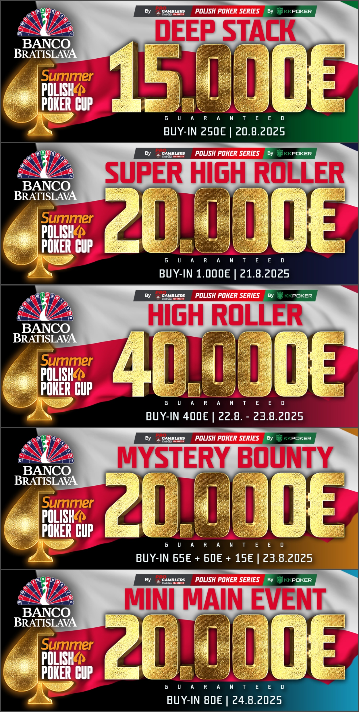 A lengyel pókerverseny-sorozat, a Polish Poker Cup ismét visszatért a Banco Bratislavába. Ezúttal a nyári kiadásról van szó, amely alatt a pókerterem pezsegni fog. Kiváló tornák és még jobb cash game-ek várják a résztvevőket a hét végéig, számos lengyel játékos érkezik, hogy meghódítsa Szlovákia fővárosát.