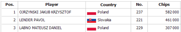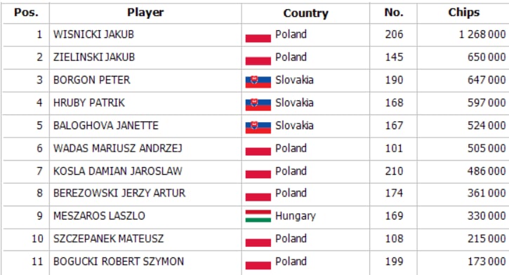 A magyar játékosok közül eddig csupán Mészáros Lászlónak sikerült továbbjutnia, mégpedig a tegnapi 1C flightról. Ő 330.000 zsetonnal folytathatja a játékot, míg az összesített chipleader az 1B-ről továbbjutó Minarík Vladimir 1.914.000 zsetonnal.