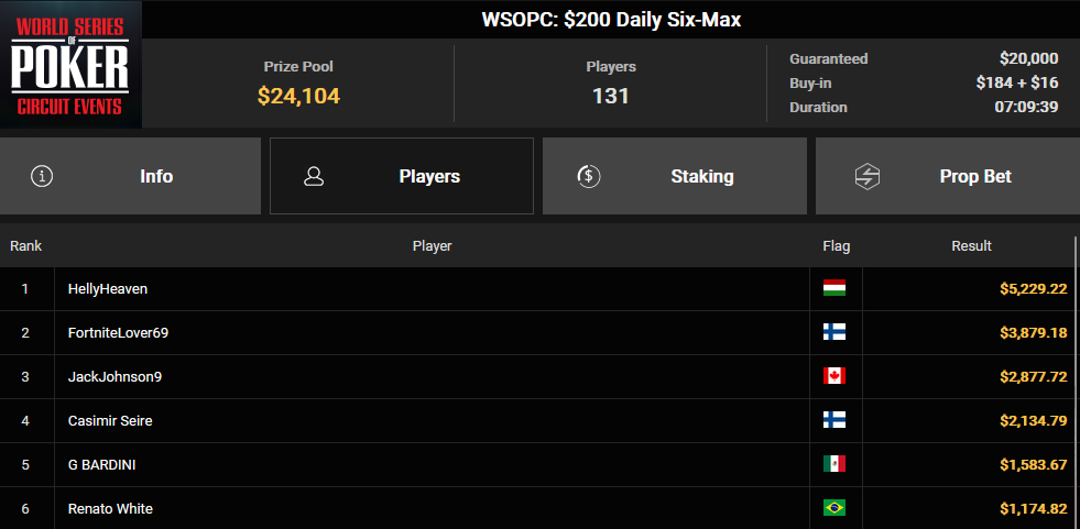 A másik event pedig amin sikerrel járt a $200 Daily Six-Max volt, ahol 131 nevezőből került ki győztesként. Ezen a tornán 5.230$ volt a jutalma, ő tehát összesen 13.194$-t nyert.