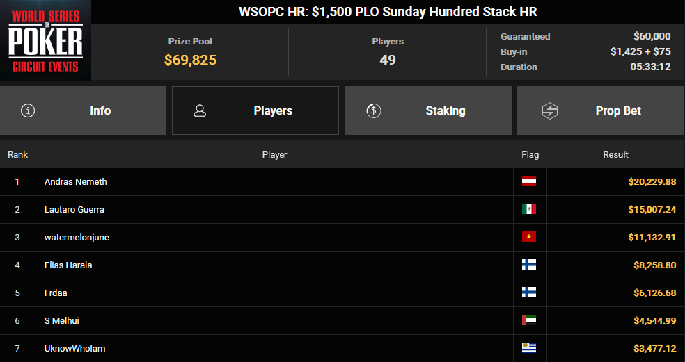 Az $1.500 PLO Sunday Hundred Stack HR szintén András győzelmével zárult. A tornán 49 nevezés és 69.825$-os nyereményalap gyűltössze, amelyből honfitársunk 20.230$-t vihetett el. A két tornáról tehát összesen 102.729$-t gyűjtött be.