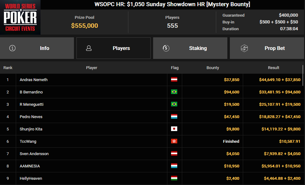 A GG termében jelenleg WSOPC online eventek zajlanak, amelyeken több magyar pókeres is részt vesz. Jelenleg a legkiseresebb közülük Németh András, aki az elmúlt éjjel két ilyen tornát is megnyert. Az egyik az $1.050 Sunday Sohwdown HR volt, ahol 555 nevezőből lett első. A bajnoki cím 37.850$-t ért, amihez még további 44.649$-t gyűjtött be a bountykból.