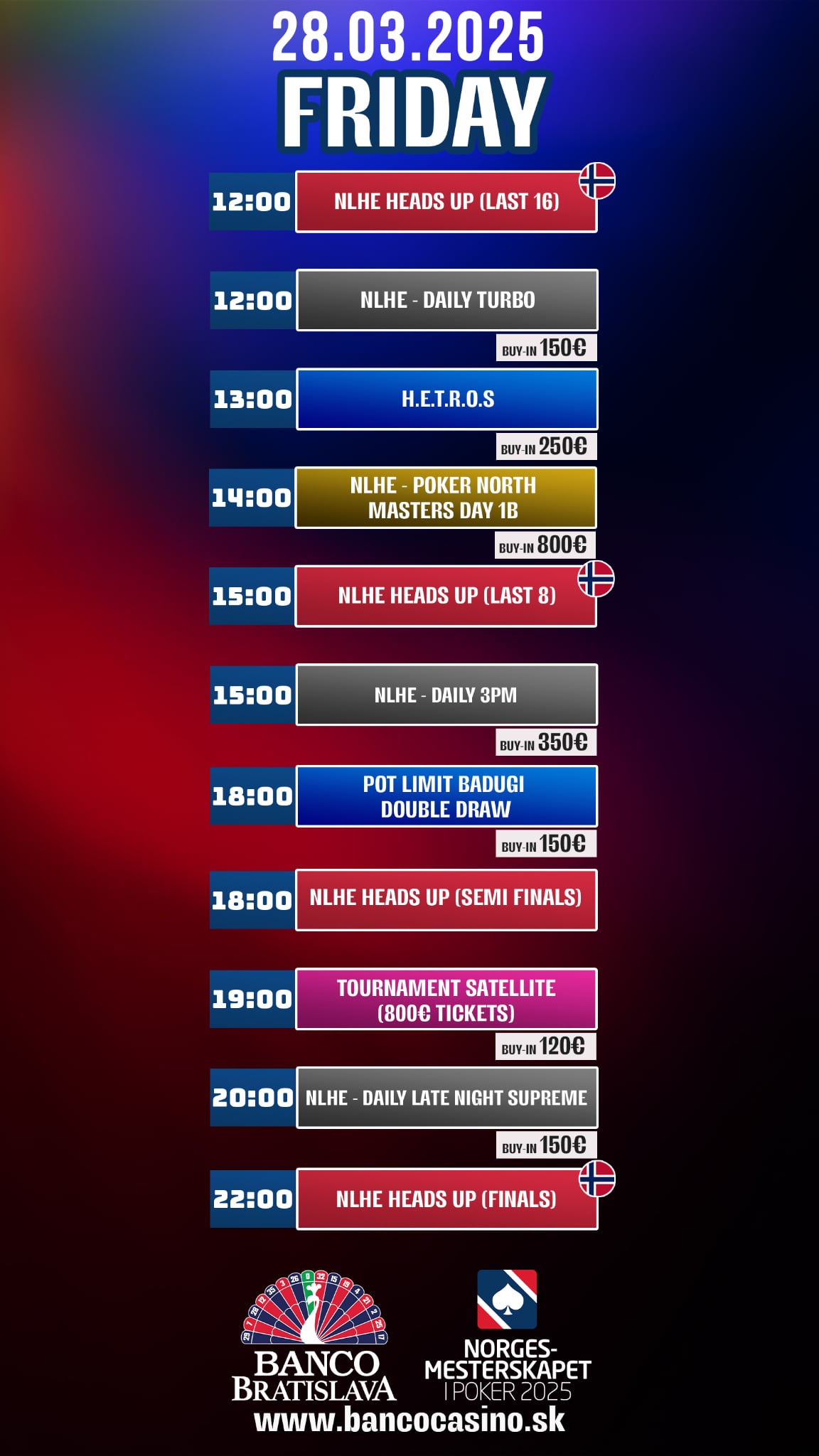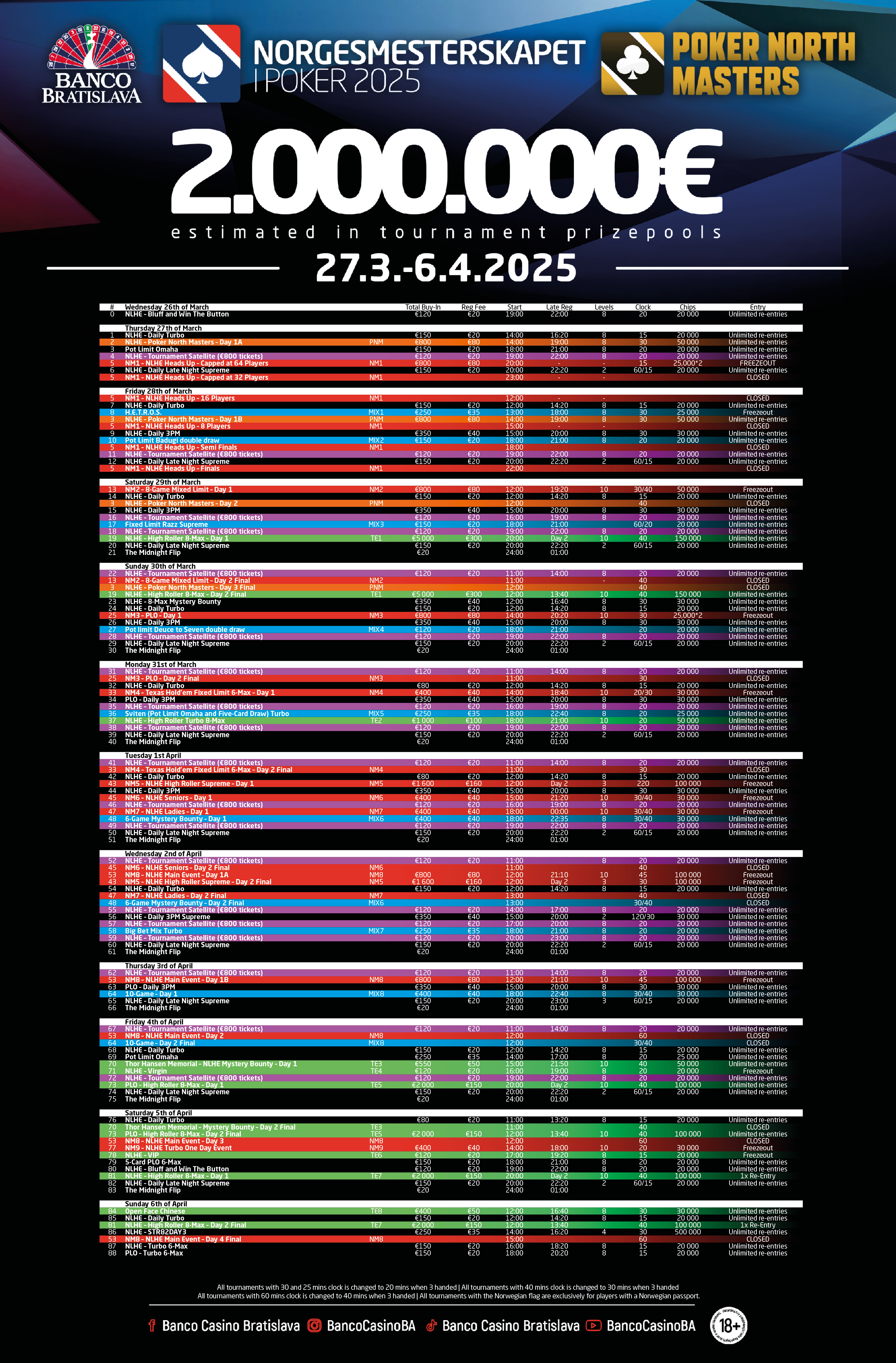 A pozsonyi Banco Casinoban kezdetét vette a várt várt Norvé Pókerbajnokság, azaz a Norges - Mesterskapet. A fesztivál során összesen több, mint 80 verseny kerül megrendezésre 2.000.000€-s összgaranciával.