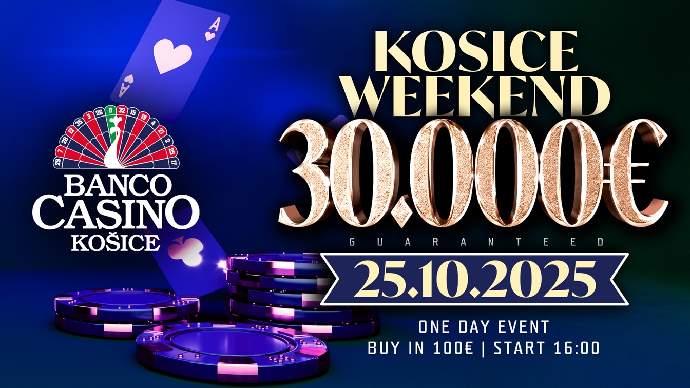 Az októberi programban nem hiányzik a kedvelt, történelmi Košice Weekend sem, amely ebben a hónapban 30.000€ garanciát hoz 100€ buy-in mellett. Ez a nagyszerű egynapos torna október 25-én kerül megrendezésre, és nem szabad kihagyni a lehetőséget a győzelemért ebben a versenyben.