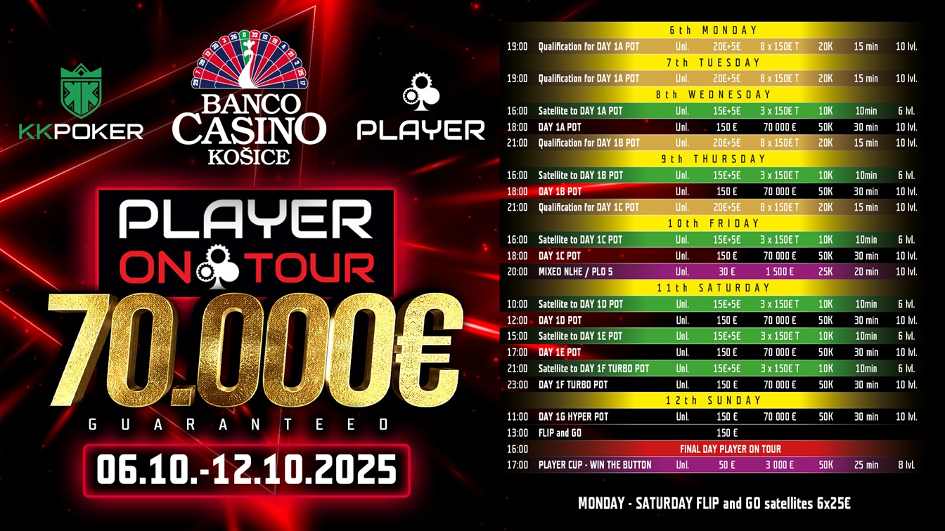 Október elején a Banco Casino Košice ad otthont a Player on Tour eseménynek, amelynek Main Event-je 70.000€ garanciát kínál. A Player on Tour október 6-án indul az első szatellitekkel. Maga a Main Event október 8-án szerdán kezdődik az első játéknappal, és a játék napok egészen október 12-ig, vasárnapig tartanak. Ekkor ismerjük meg a bajnokot is, akire nagy nyeremény vár.