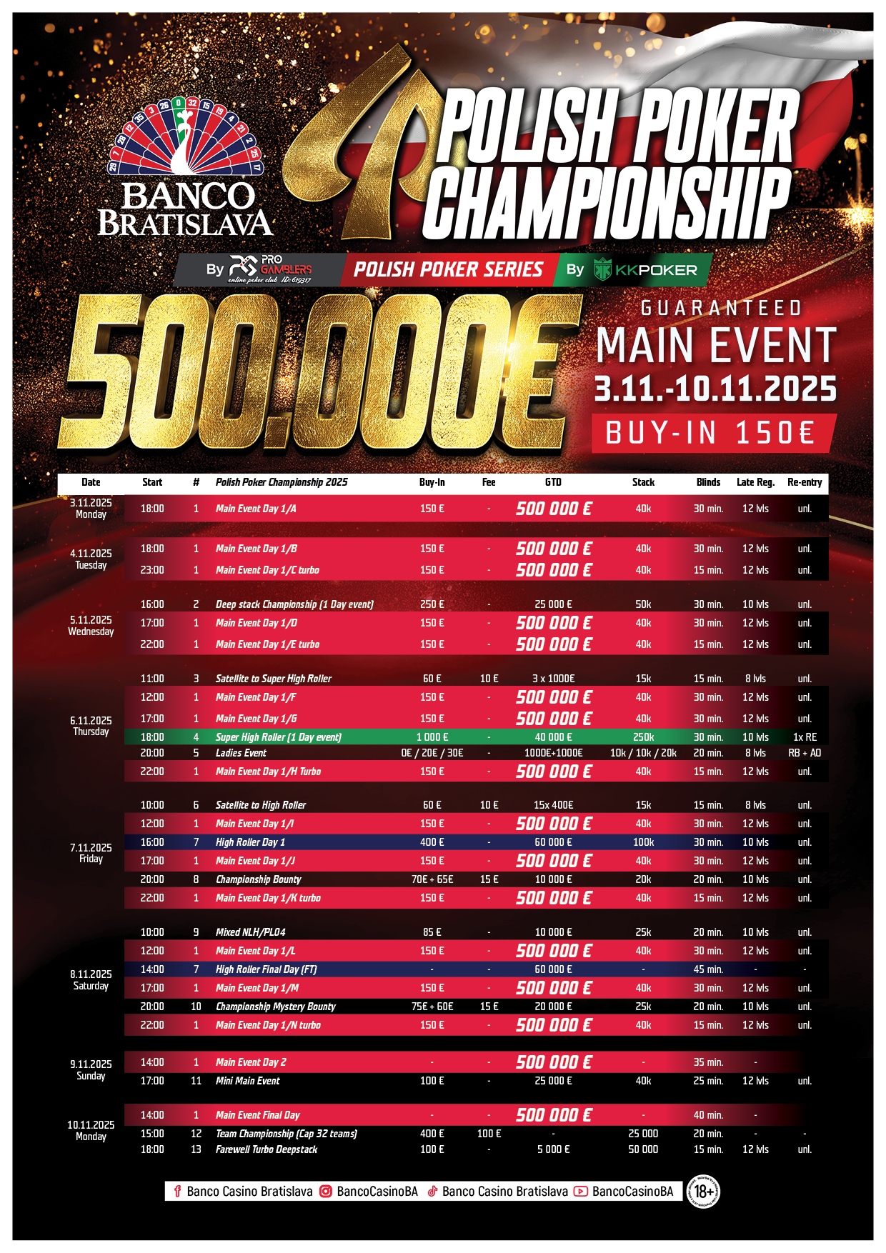 A Lengyel Pókerbajnokság izgalmas akciót hoz Pozsonyba, nemcsak a félmilliós garanciájú Main Event révén, hanem a hatalmas prizepoolokért zajló side eventekkel is, amelyek 2025 bajnokait koronázzák. Nemcsak a tornák, de a cash game asztalok is remek részvételre számíthatnak. A Lengyel Bajnokság rekordokat dönt majd, és Ön is részese lehet a póker történelmének a Banco Bratislavában.