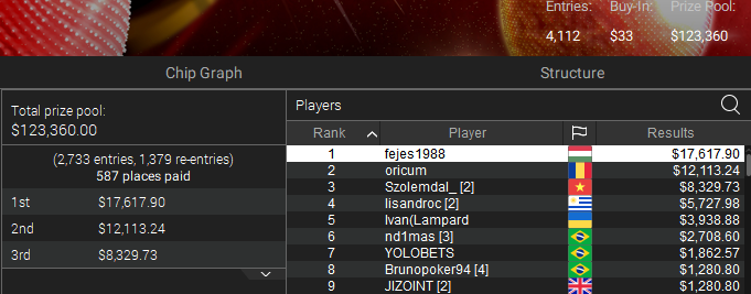 Nem ő volt azonban az egyedüli magyar pókeres aki tornát nyert a sorozaton. A 101-M: $33 NLHE legjobbja ugyanis fejes1988 lett, aki a 33$-os nevezési díjat 17.618$-os nyereményre váltotta.Ez a jutalom a befektetésének 534-szeresét jelenti! Honfitársunknak nem volt könnyű dolga, ugyanis 4.112 nevező közt kellett helytállnia, de ez tökéletesen sikerült neki.