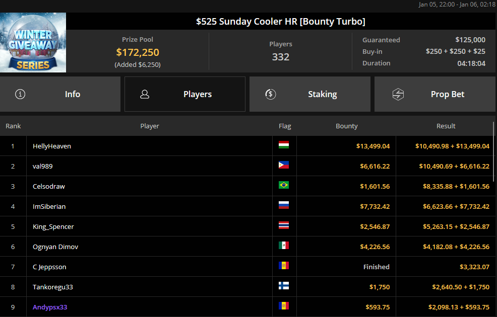 A GG termében is remekeltek honfitársaink. HellyHeaven az $525 Sunday Cooler HR mezőnyén söpört végig és meg sem állt a bajnoki címig, amiért 10.491$ járt. Ezen kívül további 13.499$-t vitt el a bountykból, így összesen 23.990$-al növelte bankrollját.