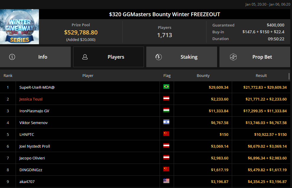 A $320 GGMasters Bounty Winter Freezouton pedig IronPlasmajo GV jutott a torna döntő asztalára. Azon 1.713 játékos indult és 529.789$-os nyereményalap alakult ki, amelyből honfitársunk a bountykkal együtt 28.633$-t vihetett el, miután a harmadik helyen zárta azt.