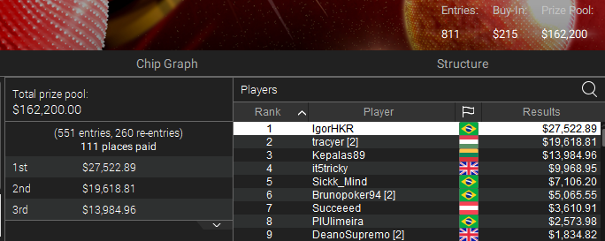 A 112-M: $215 NLHE ugyancsak majdnem magyar győzelemmel zárult. A torna 811 nevezője közt volt tracyer is, akitől végül csak IgorHKR szerepelt jobban. Tracyer 19.619$-t vihetett el a 162.200$-os nyereményalapból.