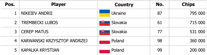 Carpathian Poker Series má za sebou dva hracie dni. Do Main Eventu naskočili hráči zatiaľ 111 krát, z čoho pramenilo 11 postupujúcich. Tí už majú istú časť zo 125.000€ garancie, o ktorú sa bojuje až do nedele 21. decembra.