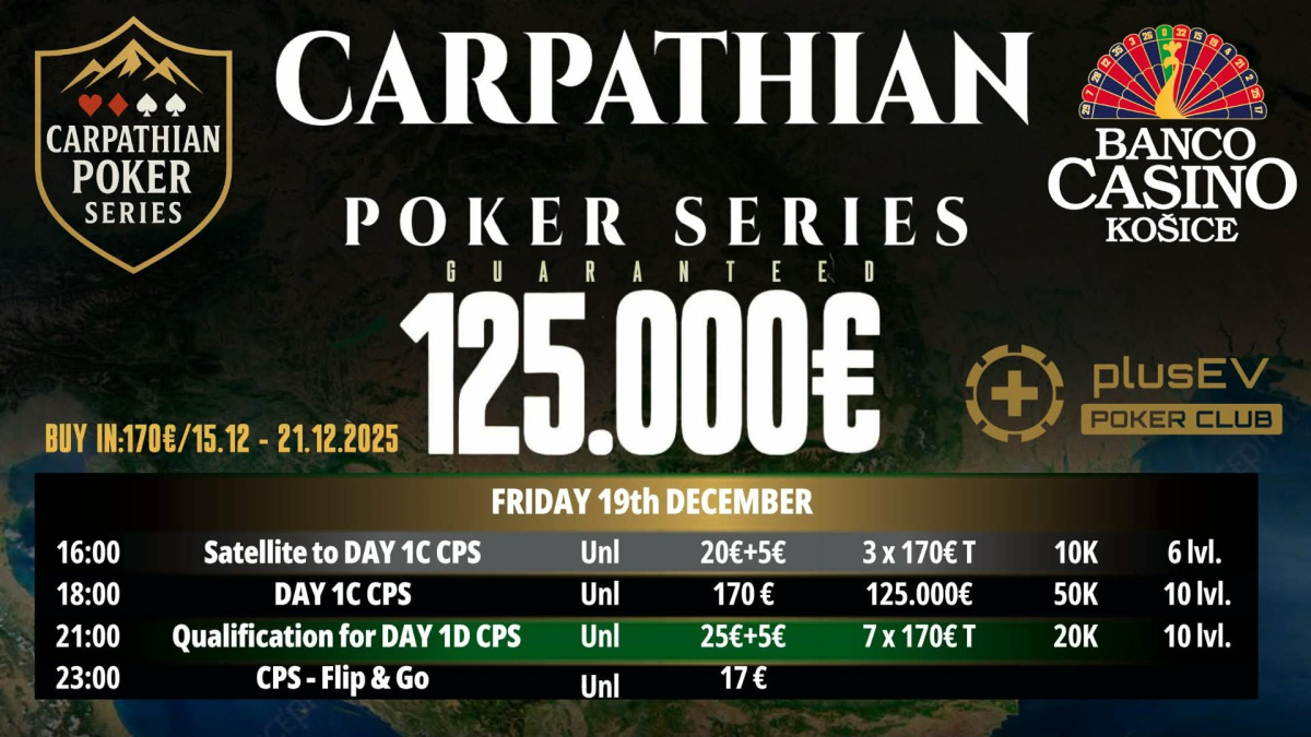 Aj dnes bude pokračovať hlavné podujatie Carpathian Poker Series tretím úvodným hracím dňom, tentokrát s označením 1C. Banco Casino Košice otvorí svoje brány pre všetkých nadšencov pokru o 18:00 hodine, kedy sa začnú boje o ďalšie postupové miesta. V garancii chýba stále okolo 106.000€ a tak by ste si tento turnaj nemali nechať ujsť.