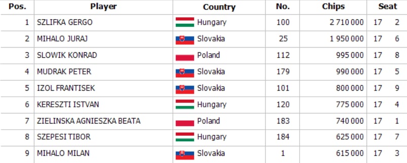 Finálovú zostavu sme spoznali po tom, čo turnaj opustili dve dámy Misumi a Točíková. Na finálový stôl nastúpil ako chipleader Gergo Szlifka so stackom 2,7 milióna chipov, ktorého doplnili viacerí domáci hráči a hráči z Maďarska a Poľska.