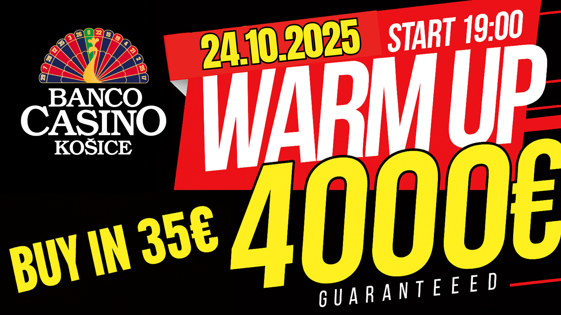 Ešte pred samotným Košice Weekendom sa v piatok 24. októbra odohrá už tradične Warm Up turnaj, ktorý pri 35€ buy-ine garantuje 4.000€, vďaka čomu sa víkendová garancia vyšplhá na 34.000€. Piatkový Warm Up odštartuje o 19:00 hodine a za vstupné dostane každý z hráčov 30.000 chipov.