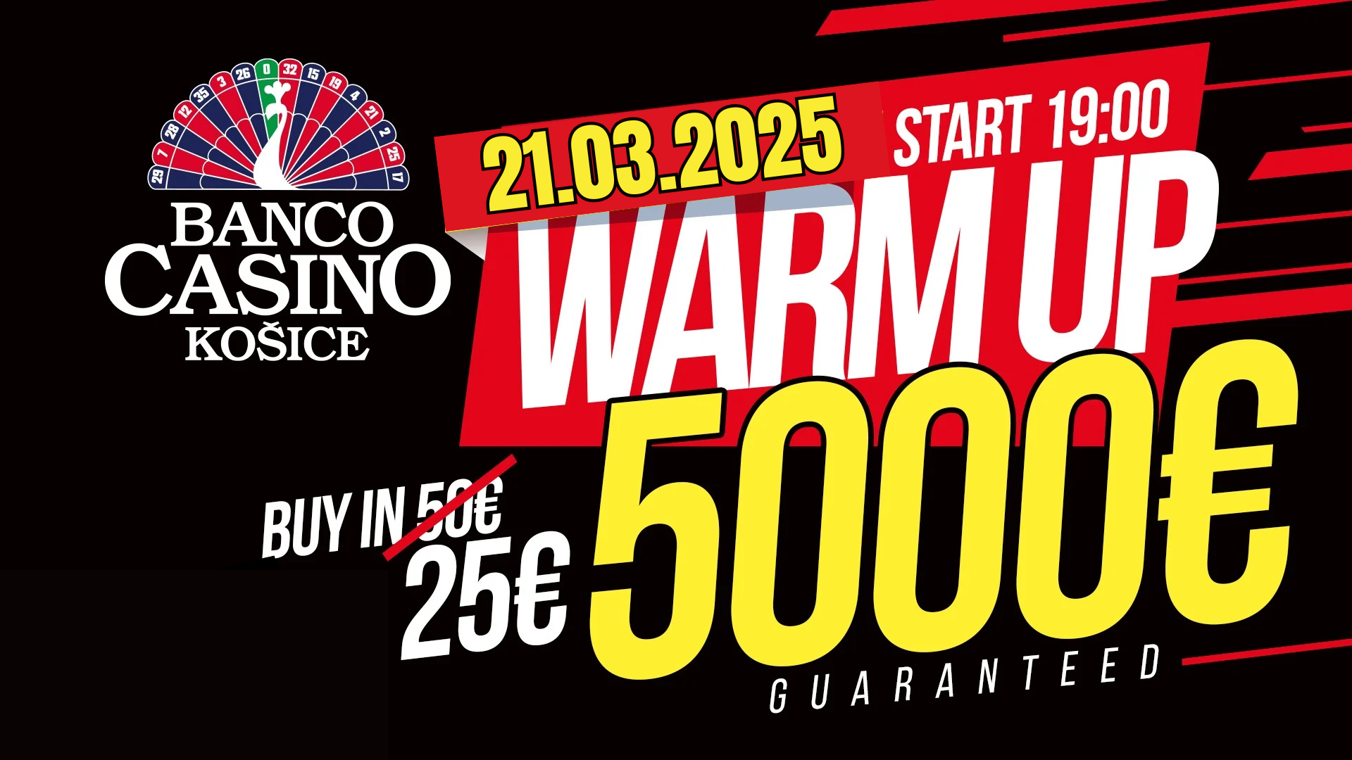 Banco Casino Košice má pre svojich verných fanúšikov a hráčov pokru, pripravený víkend plný pokru s našliapanými garanciami. V piatok 21. marca sa príďte rozohrať na Warm-Up turnaj, ktorý nesie 5.000€ garanciu za znížený buy-in. Za vstupných 25€ dostanete 30.000 žetónov na hru a 25 minútovú dĺžku levelov. Štart turnaja je naplánovaný na 19:00 a registrácia bude k dispozícii až do konca 10. levelu.