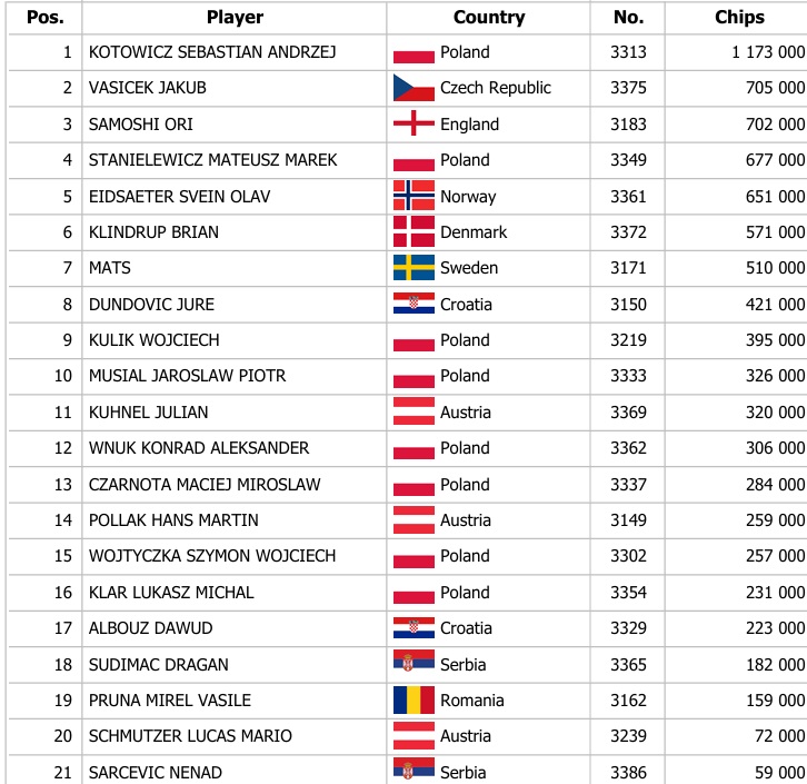 Sobota sa stala najsilnejším hracím dňom Main Eventu, pretože sa do neho zaregistrovali hráči až 1.225 krát. Už na pravé poludnie zaregistroval flight 1K 575 vstupov. Flight 1L ďalších krásnych 439 vstupov a večerné Turbo prinieslo ešte 211 vstupov. Menoslov postupujúcich si môžete pozrieť na konci článku.