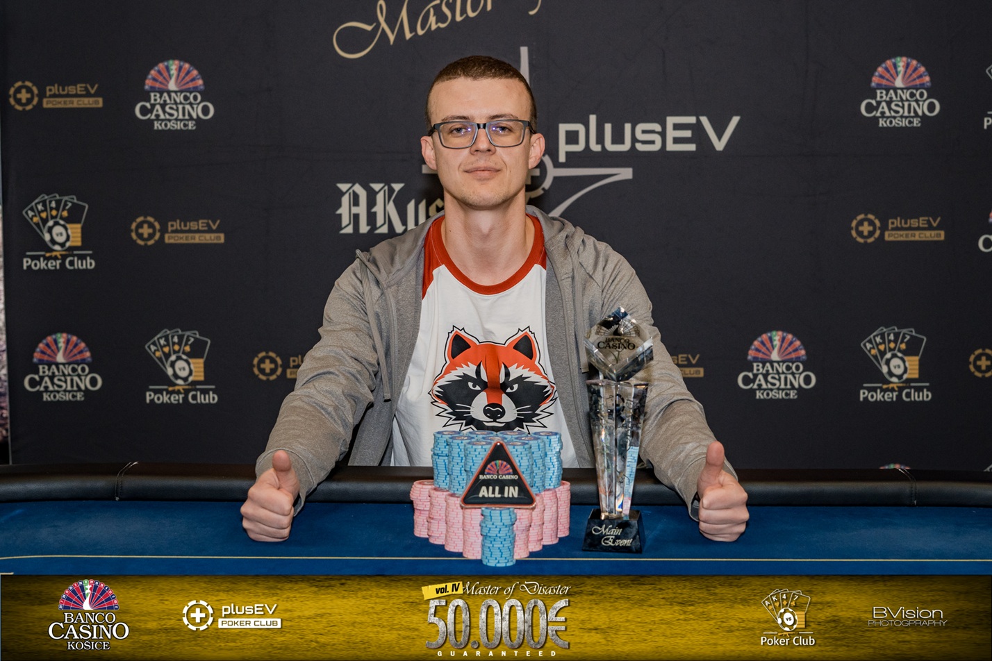V poslednej hre večera poslal Stefano všetko do hry so sedmičkami a Szczepanski s AQo dorovnal. Eso aj queena na flope pomohla Szczepanskimu, ktorý ovládol aj dohrávku a stal sa tak back to back šampiónom Master of Disaster vol. IV. Celkovo si tak z Banco Casino Košice odniesol 10.779€ a krásnu trofej. Gratulujeme!